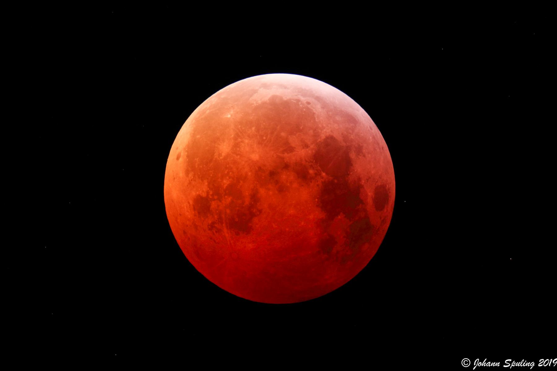 Die Totale Mondfinsternis vom 21. Januar 2019 war in den Frühstunden von ganz Deutschland aus zu sehen (1). Die Temperaturen waren sehr frostig, bei klarem Himmel. Während der Totalität wirkte der Sternenhimmel wie bei Neumond. Im Verlauf der Finsternis bedeckte der Mond auch mehrere Sterne.